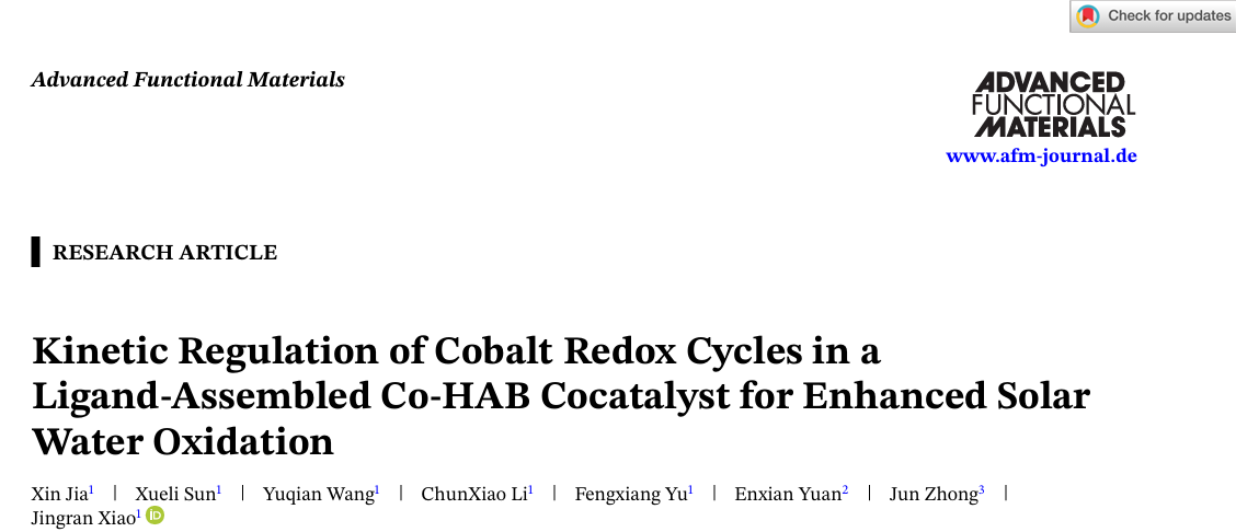 肖静冉(学术教授)等人在光电催化水分解领域取得重要进展,相关成果以“Kinetic Regulation of Cobalt Redox Cycles in a Ligand-Assembled Co-HAB Cocatalyst for Enhanced Solar Water Oxidation”为题发表在国际知名学术期刊《Advanced Functional Materials》上(中科院一区Top,影响因子:19),该文章第一作者为亚洲娱乐城